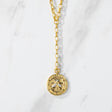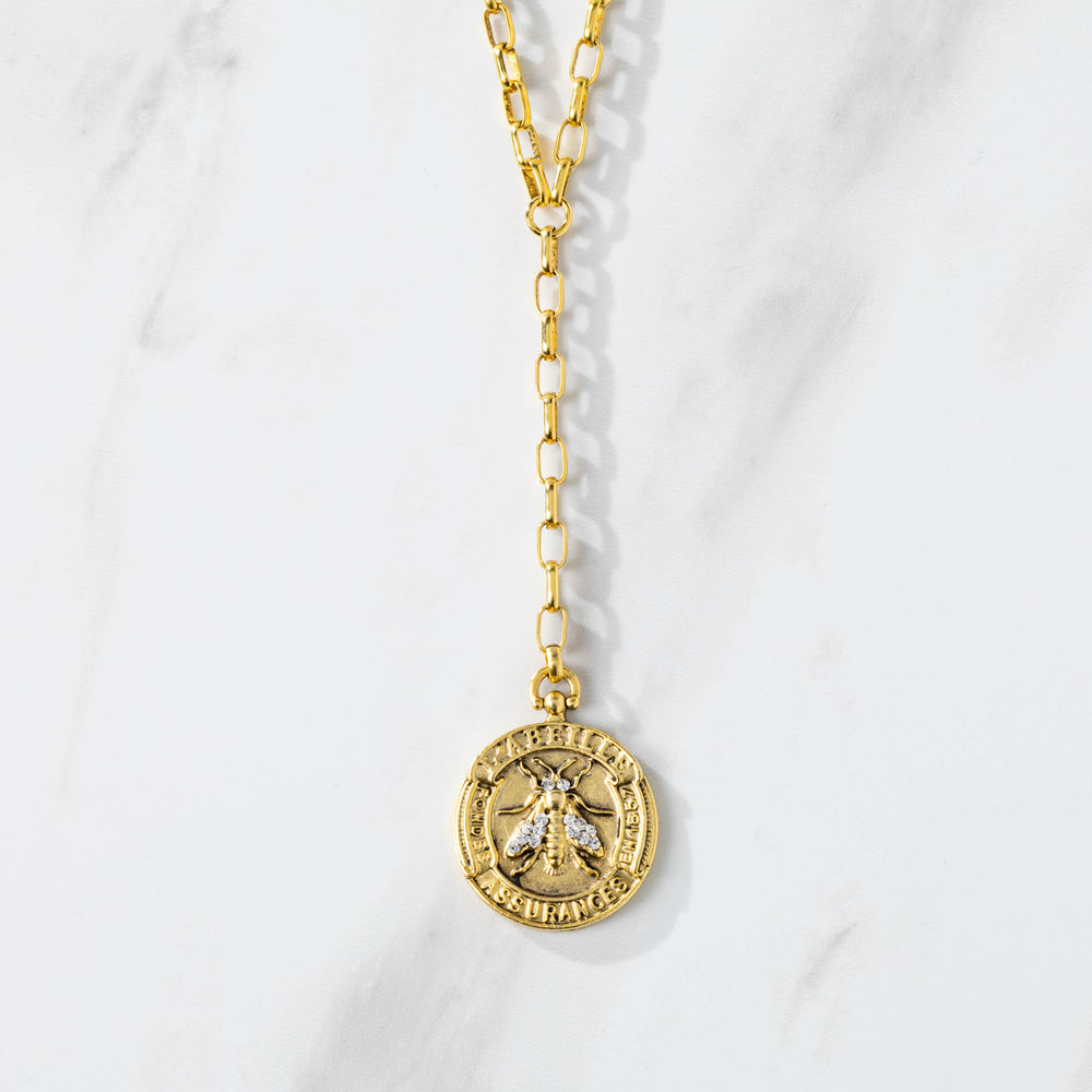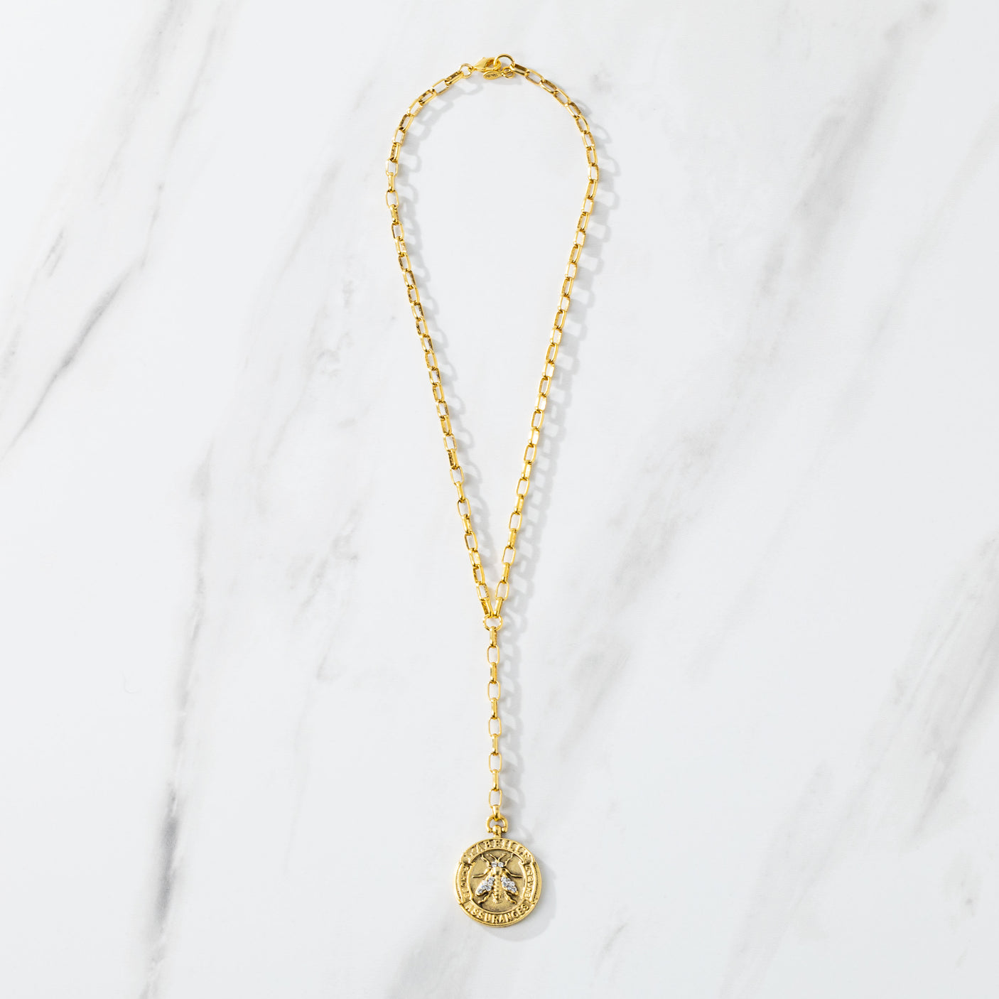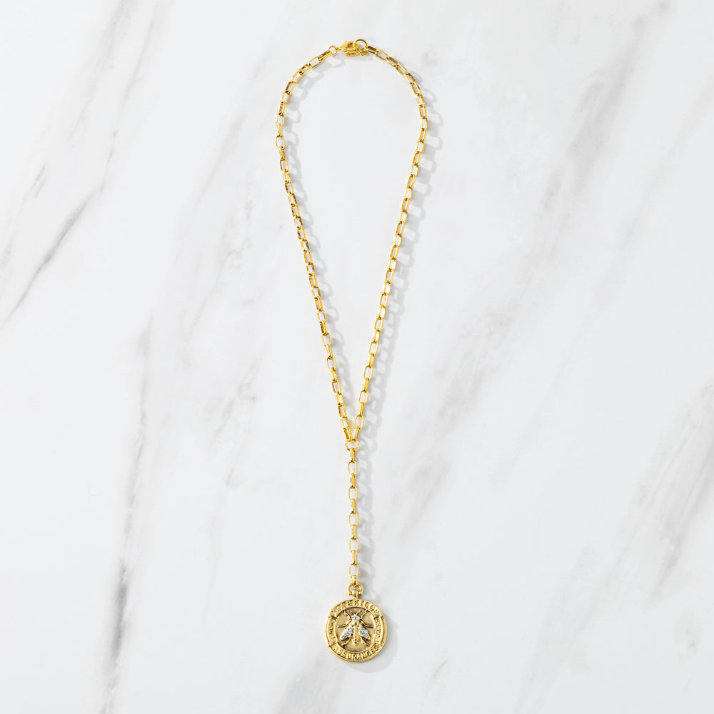 The Bee Pendant Necklace beautifully features Cubic Zirconia stones around the Brass, 22K Gold Plated Bee Coin!