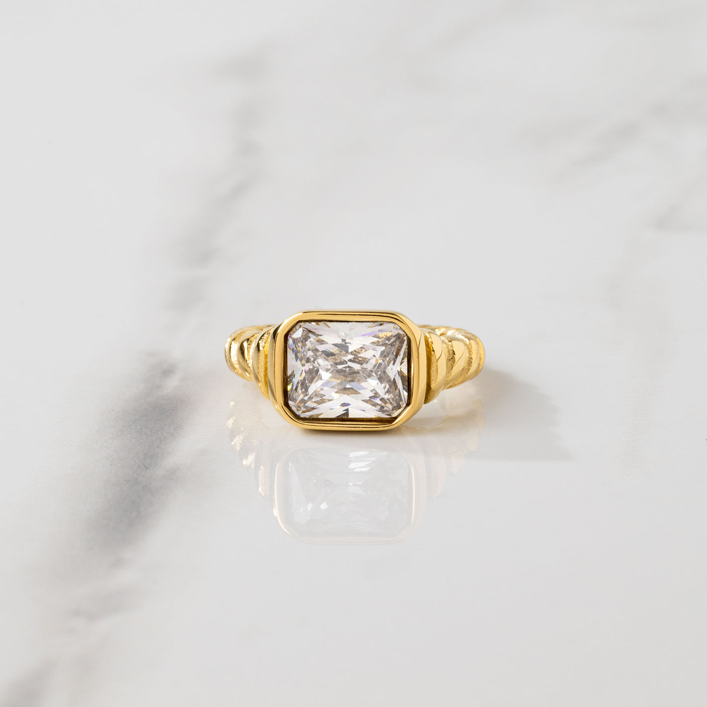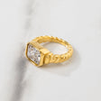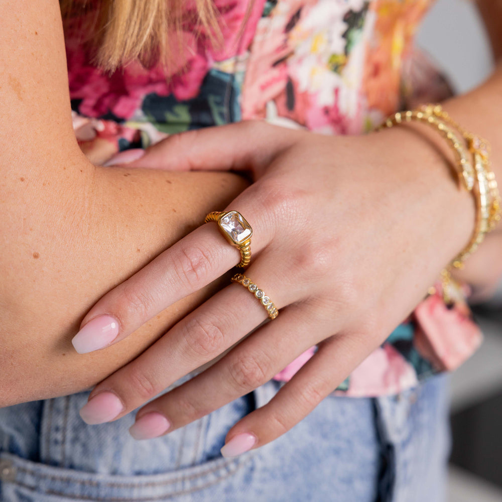 This Gold and Natural (Clear) Gemstone Ring is an 18K Plated Stainless Steel Ring making it waterproof and built to last!